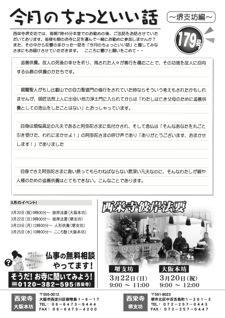 西栄寺では、大阪本坊、堺坊におきまして、彼岸会法要、盂蘭盆会法要、永代経法要を行っております。