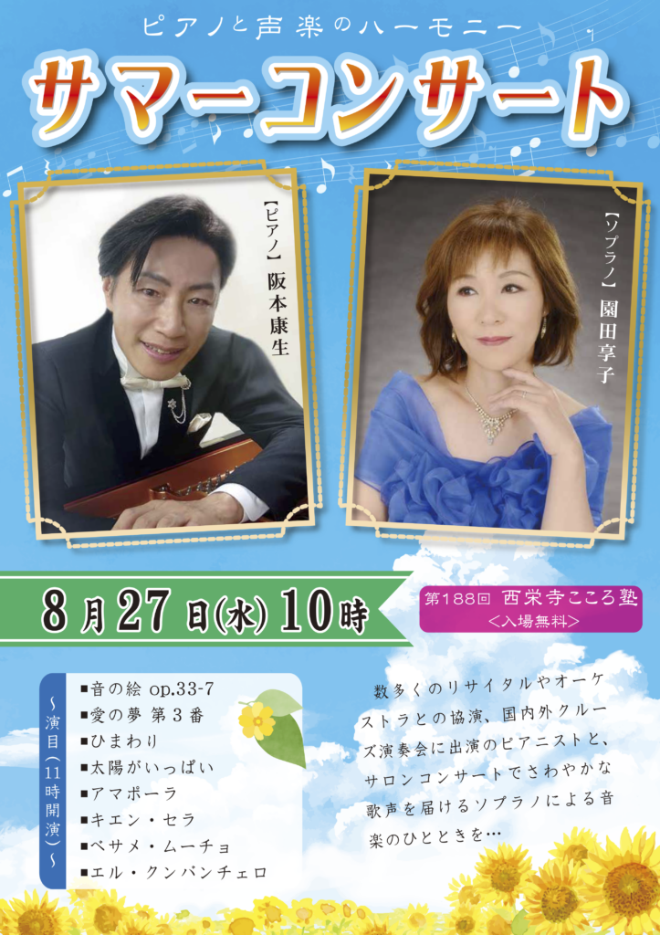 8月のこころ塾は!?数多くのリサイタルやオーケストラとの協演、国内外クルーズ演奏会に出演のピアニストと、サロンコンサートでさわやかな歌声を届けるソプラノによる音楽のひとときを… 開催場所 大本山大阪本坊 開催日時 2025年8月27日(水)10時スタート -