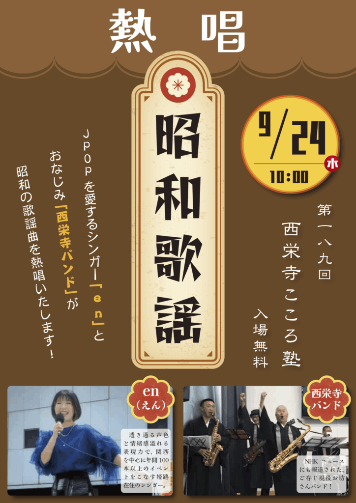 9月のこころ塾は!?JPOPを愛するシンガー「en」とおなじみ「西栄寺バンド」が昭和の歌謡曲を熱唱いたします! 開催場所 大本山大阪本坊 開催日時 2025年9月24日(水)10時スタート -