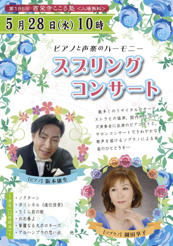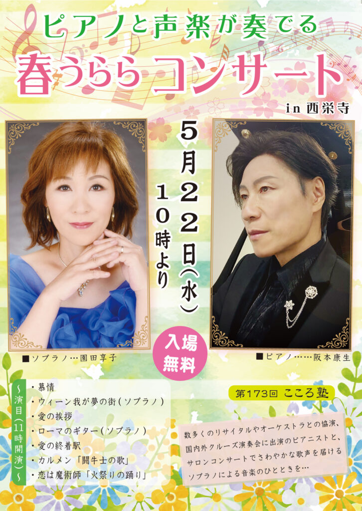 5月のこころ塾は?!数多くのリサイタルやオーケストラとの協演、国内外クルーズ演奏会に出演のピアニストと、サロンコンサートでさわやかな歌声を届けるソプラノによる音楽のひとときを… 開催場所 大本山大阪本坊 開催日時 2025年5月28日(水)10時スタート -