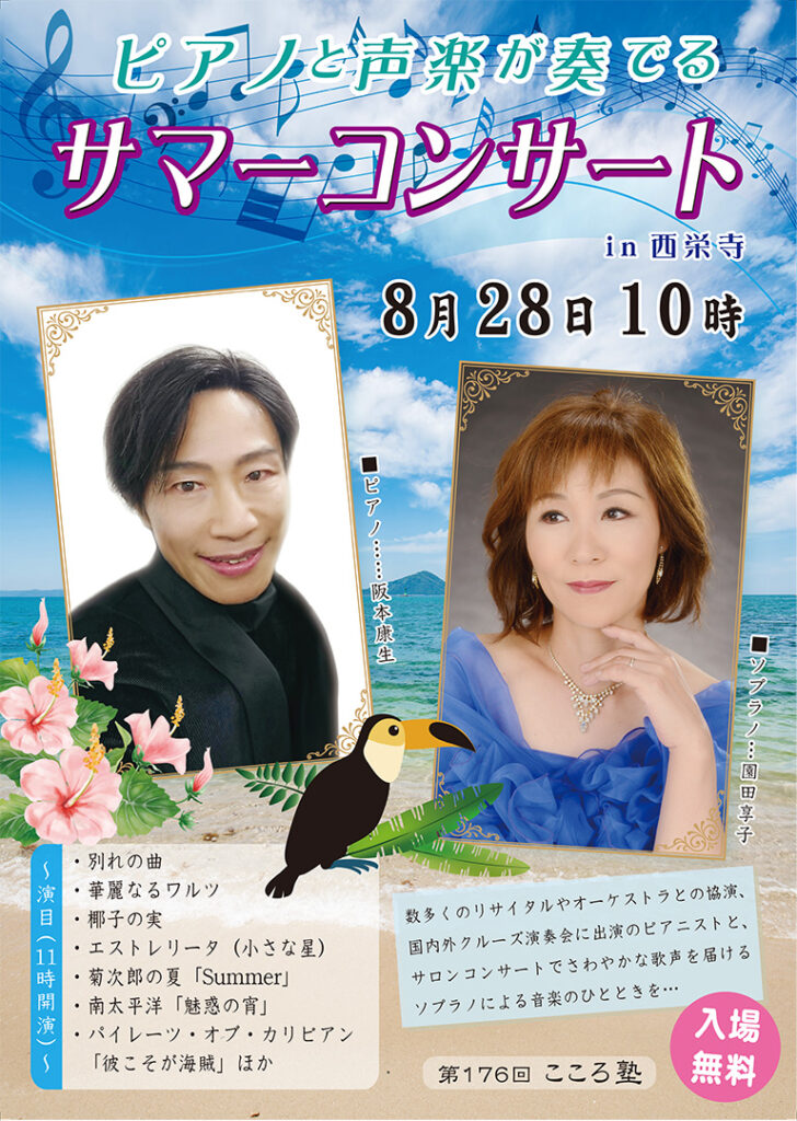 8月のこころ塾は?!恒例の阪本先生と園田先生によるサマーコンサートです🎵プロのピアノ演奏の迫力とソプラノの美しいハーモニーをお楽しみください! 開催場所 大本山大阪本坊 開催日時 2024年8月28日(水)10時スタート -