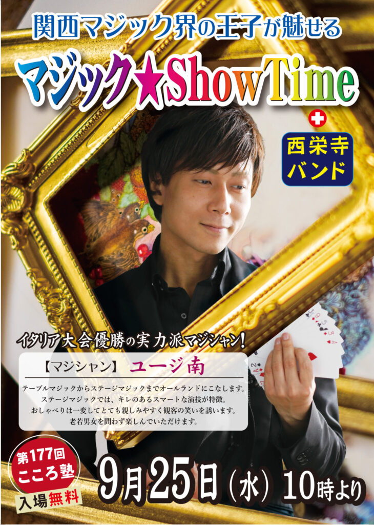 9月のこころ塾は?!イタリア大会でも優勝した、関西マジック界の王子と呼ばれる、【ユージ南】さんの華麗なるマジック!世界トップクラスの技をご堪能下さい!! 開催場所 大本山大阪本坊 開催日時 2024年9月25日(水)10時スタート -