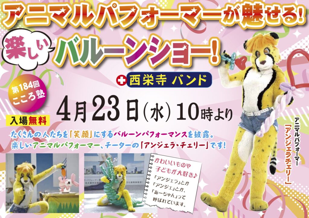 4月のこころ塾は?!たくさんの人たちを「笑顔」にするバルーンパフォーマンスを披露。楽しいアニマルパフォーマー、チーターの「アンジェラ・チェリー」です! 開催場所 大本山大阪本坊 開催日時 2025年4月23日(水)10時スタート -