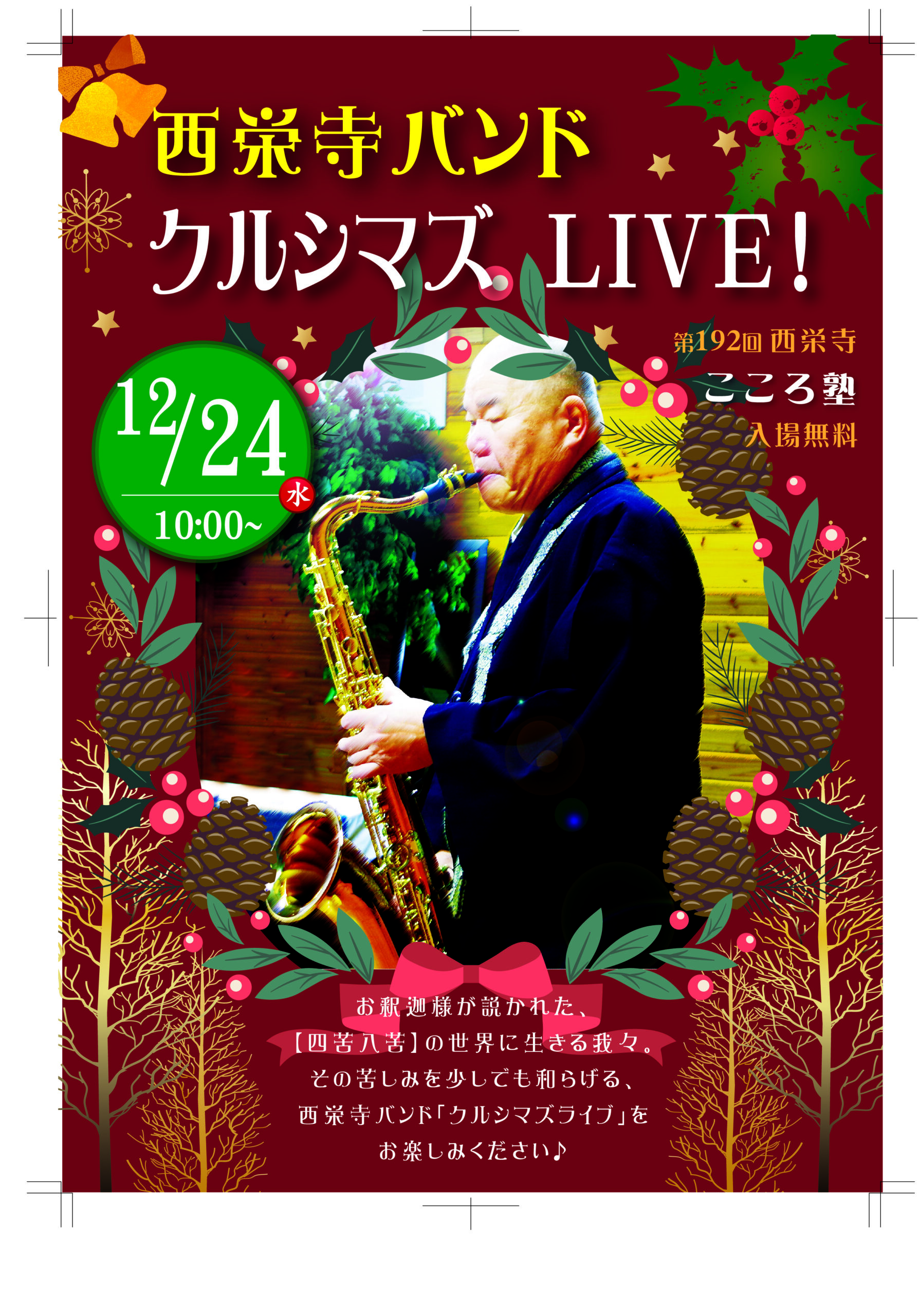 12月のこころ塾は!?お釈迦様が説かれた、「四苦八苦」の世界に生きる我々。その苦しみを少しでも和らげる、西栄寺バンド「クルシマズライブ」をお楽しみください♪